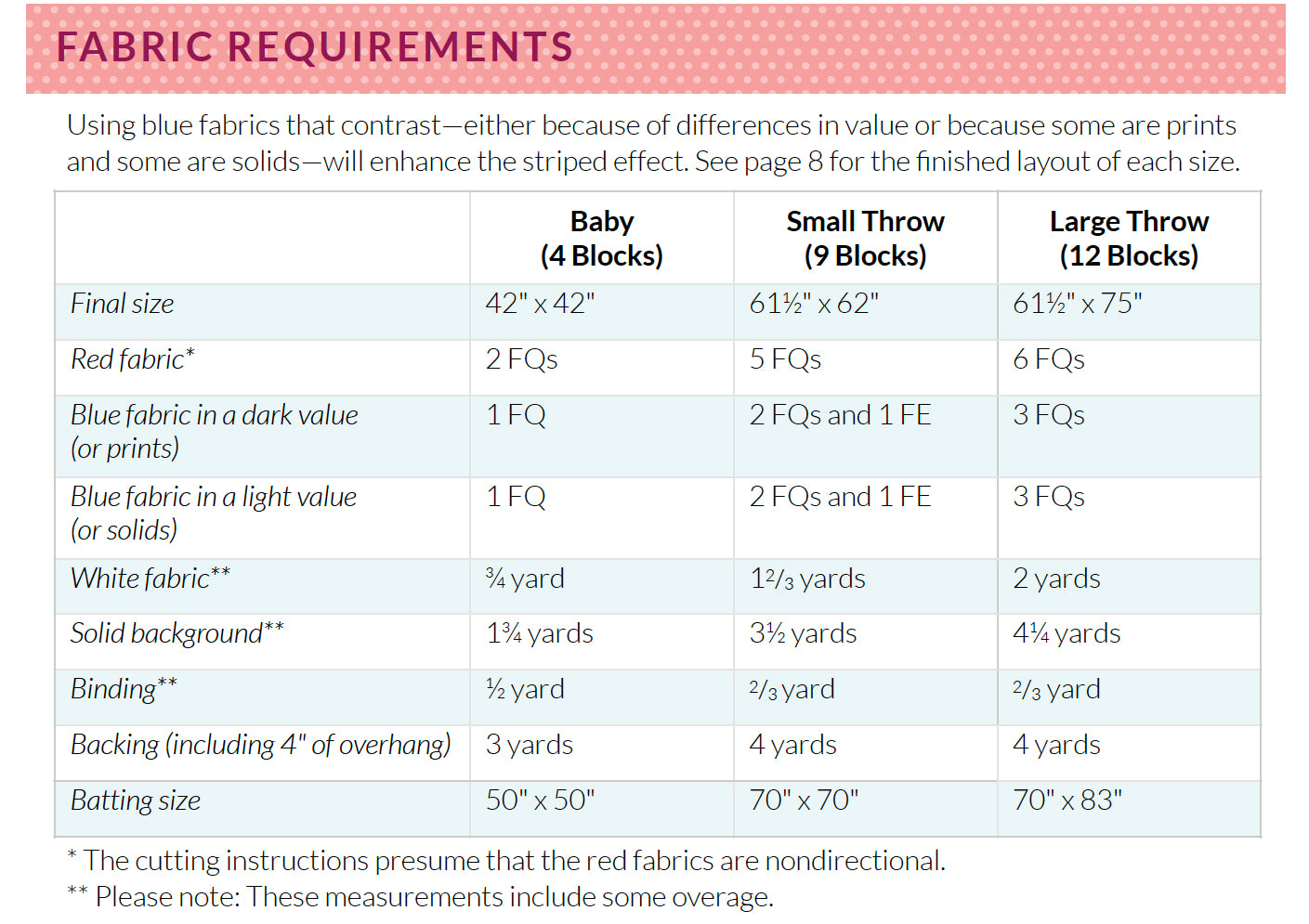 The pattern provides instructions for three quilt sizes: